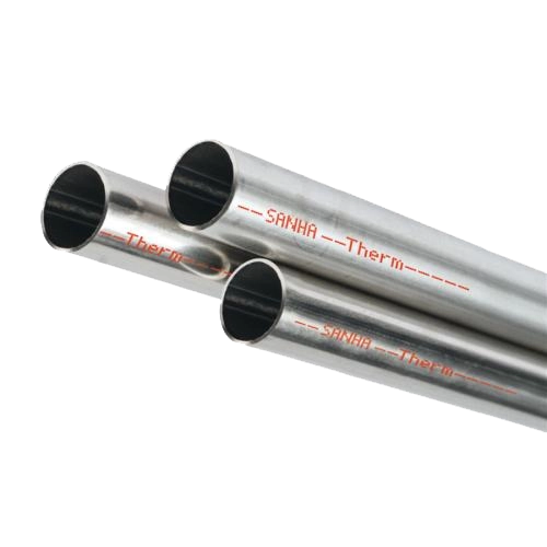 Сталь оцинкованная снаружи. Пресс-система SANHA®-Therm включает в себя качественные пресс-фитинги SANHA®-Therm с красным уплотнением из FKM (фторкаучук мономер) для применения в условиях повышенной температуры и трубы из высокоуглеродистой стали SANHA®-Therm по DIN EN 10305-3. Тщательно разработанная пресс-система SANHA®-Therm и её компоненты предлагают экономичное решение для замкнутых систем отопления. В то же время SANHA®-Therm отлично подходит для пневматических систем и систем пожаротушения по DIN EN 10346 (серия DZ). Вариант «Contiflo» предлагает системные трубы, обработанные методом горячего цинкования. Трубы из углеродистой стали требуют соблюдения особых условий для защиты от коррозии, и поэтому могут использоваться только в соответствии с предписаниями по монтажу SANHA.